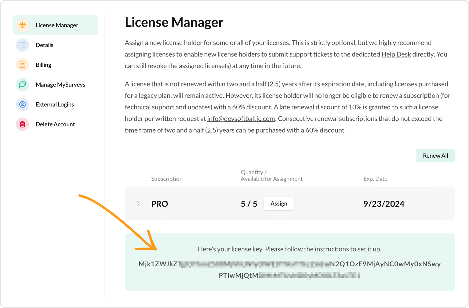 Once you have completed a purchase, you will be prompted to the order confirmation page that contains a link to your license key and the setup instructions. You'll also receive this information in the order confirmation email—sent automatically once the order is complete (for online payments by card or PayPal) or after we receive your payment (for bank transfers).